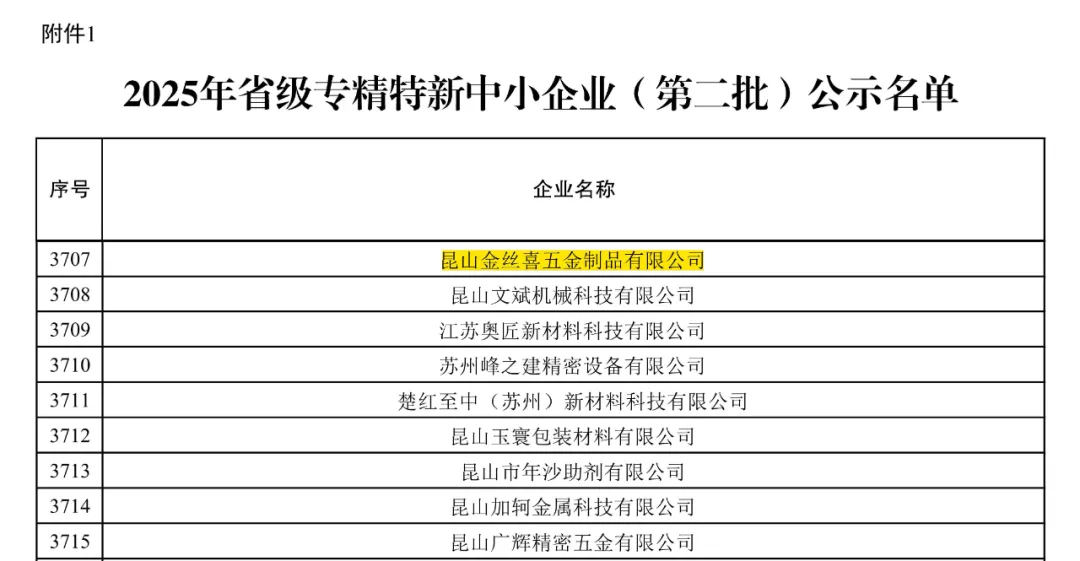 Slovenski Baru-baru ini, Departemen Perindustrian dan Teknologi Informasi Provinsi Jiangsu secara resmi mengumumkan gelombang terbaru UKM Khusus dan Canggih Jiangsu yang diakui pada tahun 2025. Kunshan Jinsixi Metalware Co., Ltd. berhasil dipilih dan dianugerahi gelar “UKM Khusus dan Canggih Jiangsu" karena akumulasi teknisnya yang mendalam, kualitas produk yang sangat baik, dan inovasi berkelanjutan di sub-sektor pengikat.